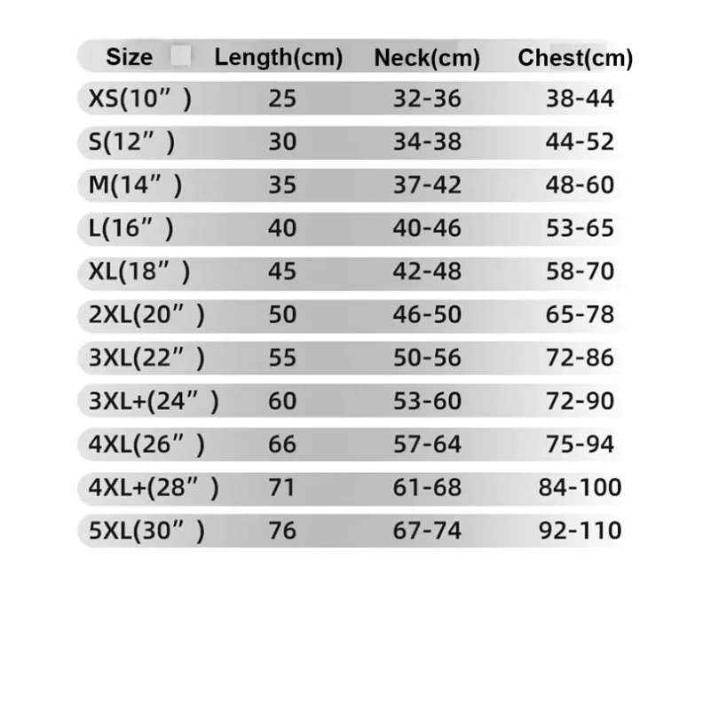 5. The clothes's size you choose should be 1-3cm larger than your pet's size;
